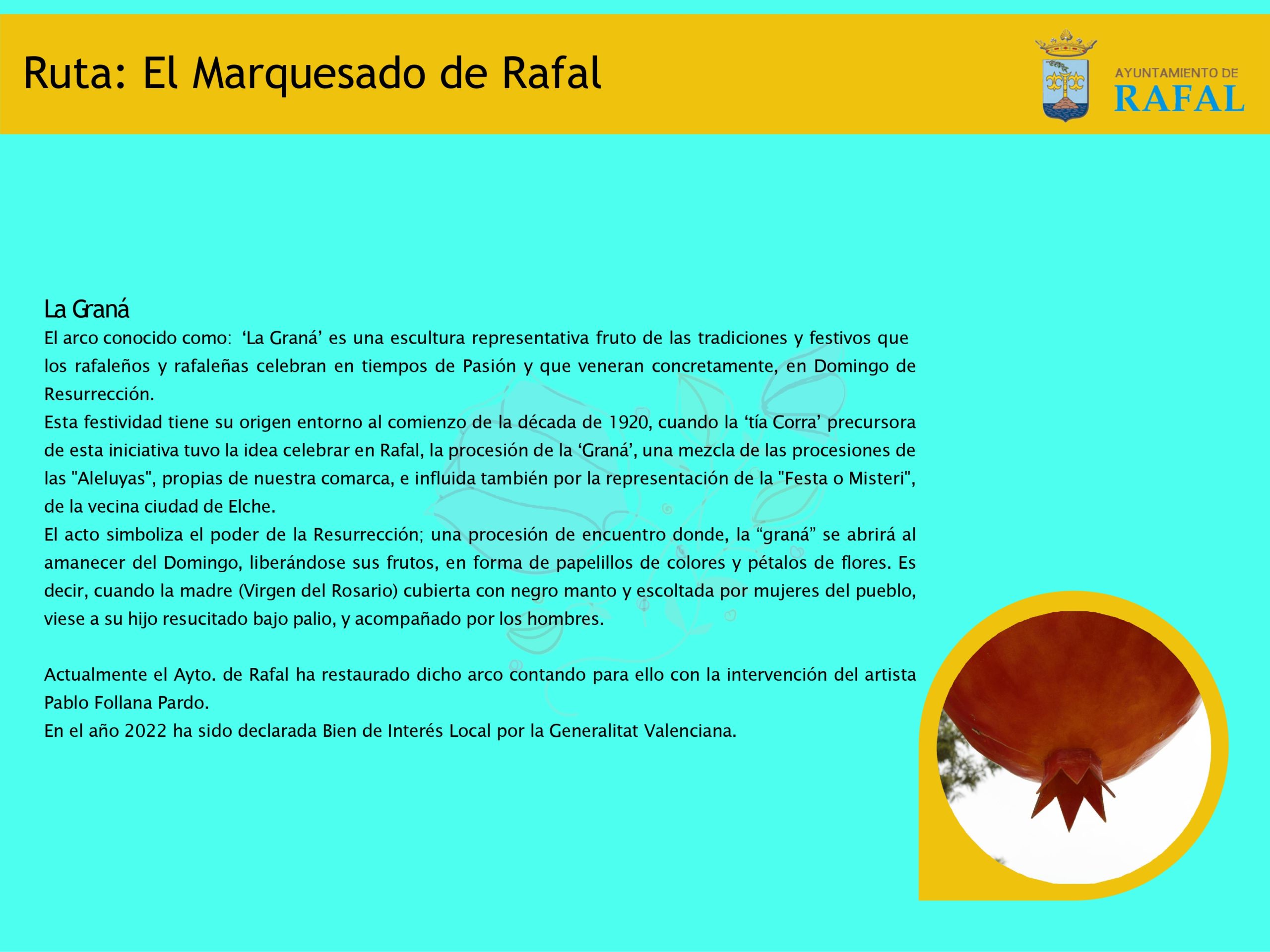 Con el nombre de la “Graná” se quiere conmemorar un acto típico de la Semana Santa Rafaleña, pero para subsanar que el arco estaba incompleto sin la “Graná”, el autodidacta y emprendedor D. Antonio Mora Hernández, tras su jubilación, reinició el proyecto de construirla y colocarla bajo el arco correspondiente, dándole una visión completa, tanto estética como simbólica.