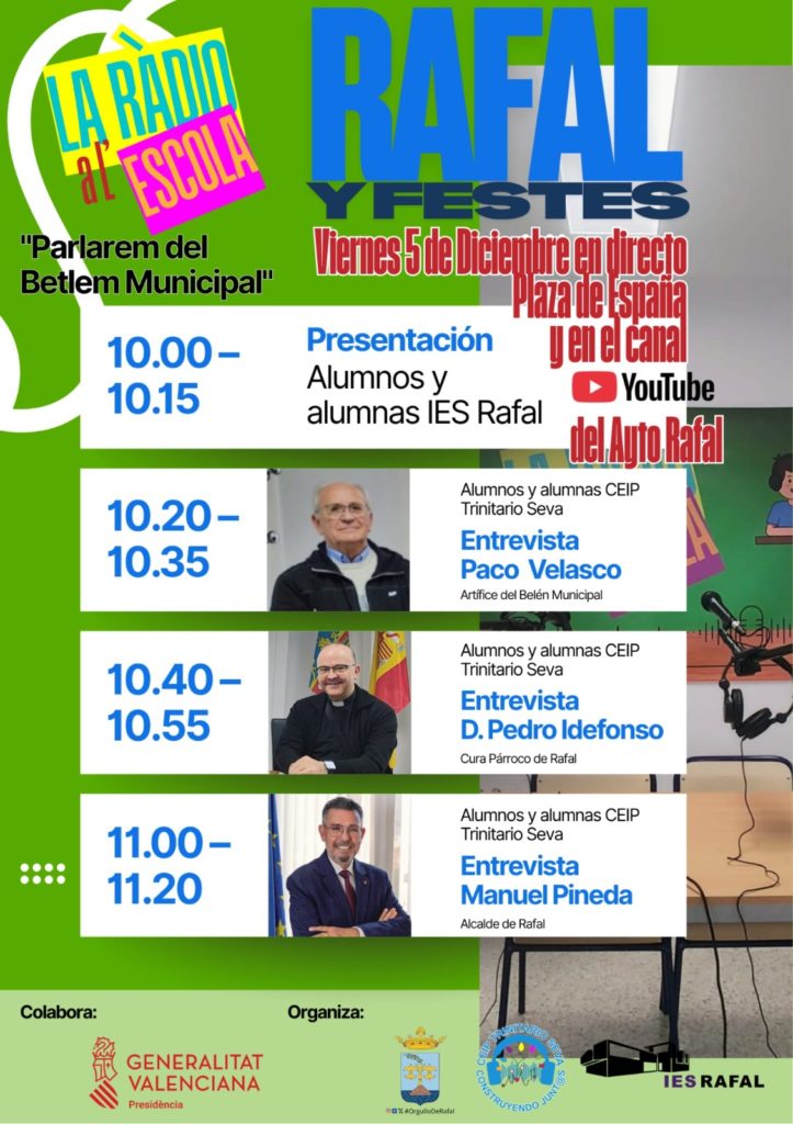 El próximo 5 de diciembre, en #Rafal, tendremos 𝗥𝗮𝗱𝗶𝗼 𝗮 𝗹’𝗘𝘀𝗰𝗼𝗹𝗮 con un programa especial en directo, que también se retransmitirá en nuestro canal de YouTube 🎥. Contaremos con distintas