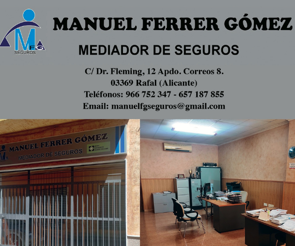 MFG SEGUROS – SEGUROS por Gabriel Valero | Dic 2, 2025 | Comercios, Seguros Dirección C. Dr. Fleming, 12 Apdo, Correos 8, 03369 Rafal, Alicante Teléfono +34 657 187 855 +34 966 752 347 Correo electrónico kamran.asghar66@gmail.com Redes sociales Seguir ← Volver a Categorías