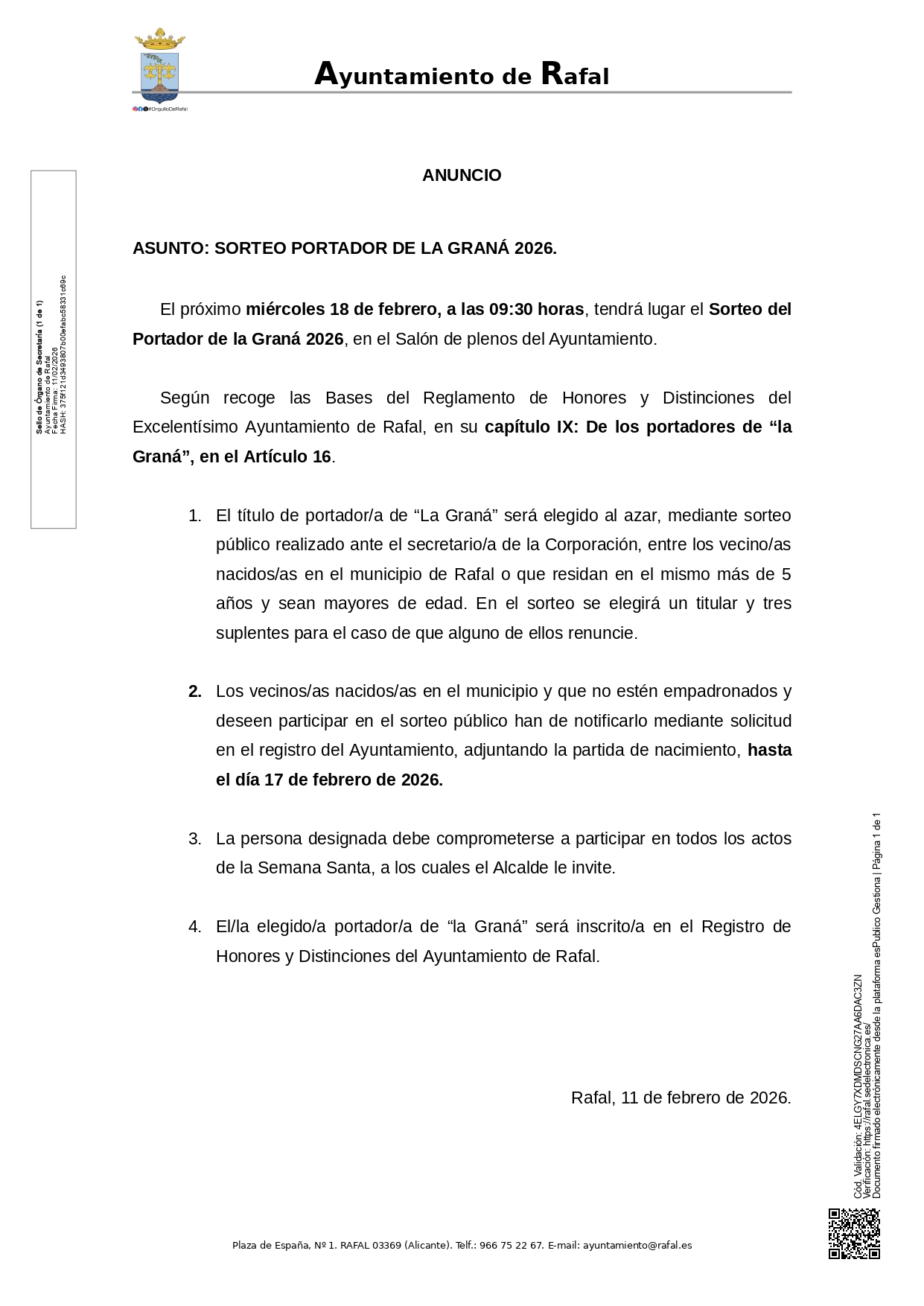 El próximo miércoles 18 de febrero, a las 9:30 horas, tendrá lugar en el Salón de Plenos del Ayuntamiento de #Rafal el Sorteo del Portador de La Graná 2026, de entre los vecino/as nacidos/as en el municipio o que residan en el mismo más de 5 años y sean mayores de edad.